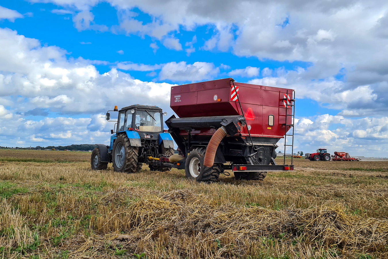 During harvest, the grain cart becomes a key element: it acts as a buffer zone between combines and vehicles, accumulating harvested grain and then sending it to the grain truck for transportation.